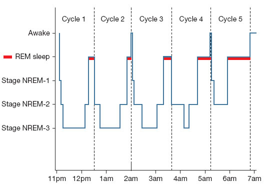 In this graph, the thin horizontal red bars represent time spent in REM sleep. REM periods tend to lengthen as the night wears on, but Stage 3, which dominates during non-REM sleep early in the night, may disappear as morning approaches.