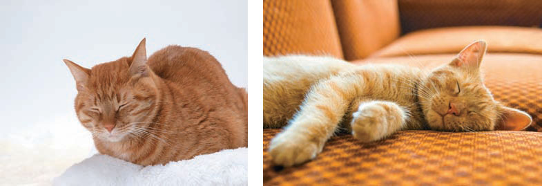 Because cats sleep up to 80 percent of the time, it is easy to catch them in the various stages of slumber. A cat in non-REM sleep (left) remains upright, but during the REM phase (right), its muscles go limp and it flops onto its side.