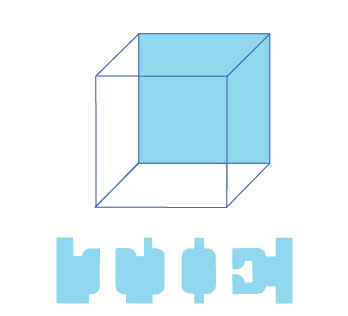 If you stare at the cube, the surface on the outside and front will suddenly be on the inside and back, or vice versa, because your brain can interpret the sensory image in two different ways. The other blue-and-white drawing can also be perceived in two ways. Do you see them?
