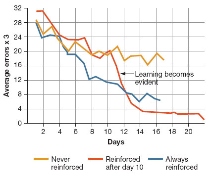 In a classic experiment, rats that always found food in a maze made fewer and fewer errors in reaching the food (blue curve). In contrast, rats that received no food showed little improvement (gold curve). But rats that got no food for 10 days and then found food on the 11th day showed rapid improvement from then on (red curve). This result suggests that learning involves cognitive changes that can occur in the absence of reinforcement and that may not be acted on until a reinforcer becomes available (Tolman & Honzik, 1930).