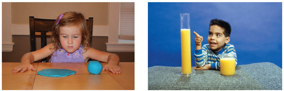 If you've got access to young children (through babysitting; as an aunt, uncle, or sibling; through a local daycare center; or as a parent yourself), you can examine some of Piagets principles yourself. In one test for conservation of size (left), the child must say which is bigger—a round lump of clay or the same amount of clay pressed flat. Preoperational children think that the flattened clay is bigger because it seems to take up more space. In a test for conservation of quantity (right), the child is shown two short glasses with equal amounts of liquid. Then the contents of one glass are poured into a tall, narrower glass, and the child is asked whether one container now has more. Most preoperational children do not understand that pouring liquid from a short glass into a taller one leaves the amount of liquid unchanged. They judge only by the height of liquid in the glass.