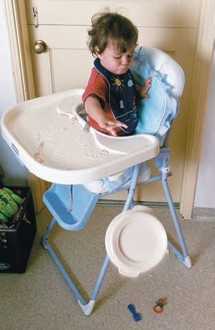 From birth to age 2, said Piaget, babies are in the sensorimotor stage. In this stage, the infant learns through concrete actions: looking, touching, putting things in the mouth, sucking, grasping. “Thinking” consists of coordinating sensory information with bodily movements. Gradually, these movements become more purposeful as the child explores the environment and learns that specific movements will produce specific results. Pulling a cloth away will reveal a hidden toy; letting go of a fuzzy toy duck will cause it to drop out of reach; banging on the table with a spoon will produce dinner (or Mom, taking the spoon away).