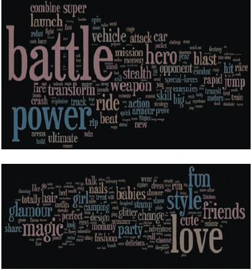 Crystal Smith transcribed a number of commercials directed to “boys” or “girls,” and made these “word clouds” out of the result. You can see at once how advertisers cater to exaggerated gender schemas.