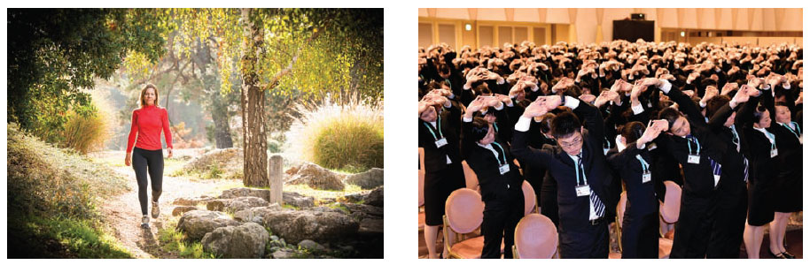 Individualistic Americans exercise by biking, walking, or jogging, going in different directions and wearing different clothes while they do it. Collectivist Japanese employees at their hiring ceremony exercise in identical fashion.